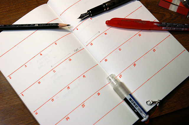 スケジュール帳は一ヶ月スクエアに限る 週間スケジュール手帳を強引に使ってきましたが。やっぱり駄目でした。一ヶ月がひとめで判るものでないと!この時期に理想的なスケジュール手帳を探すのは困難なので、とりあえず来年の手帳が出回るまでの半年間を手作りで過ごすことにしました。ベースはミドリのトラベラーズノート、無地ノートを使用しています。罫線は間違っても消せるようにとフリクションボールを使って引いています。ただ、これだとスケジュール書いても消しゴムでこすっちゃうと罫線も消えちゃうんですよね(苦笑) [1回] コメント コメントを書く コメントを書く コメント送信
