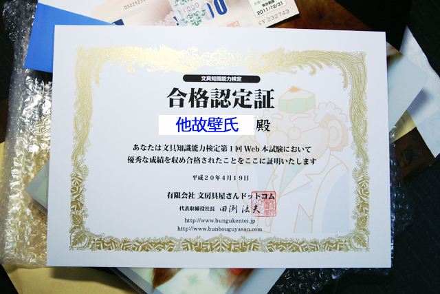 抽選で何か当たるらしい、というのは判っていましたが、今回は「第一回ということもあって」認定証発行者全員に文具券3,000円分が送られたようです。