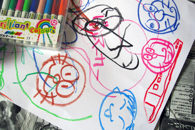 ダイノジとお絵描き 今日は朝からおよめさんがいません。なので、朝からムスメとふたりでダイノジとお絵描きタイムです。ゲルマーカーは柔らかいですね。あっという間にレフィルが減ります。ダイノジはまだ絵を描けるはずもなく、ただ線を引っ張って楽しむのみ。小生とムスメが適当な絵を描いていきます。ムスメ、その怖いドラえもんをなんとかしろ! [0回] コメント コメントを書く コメントを書く コメント送信