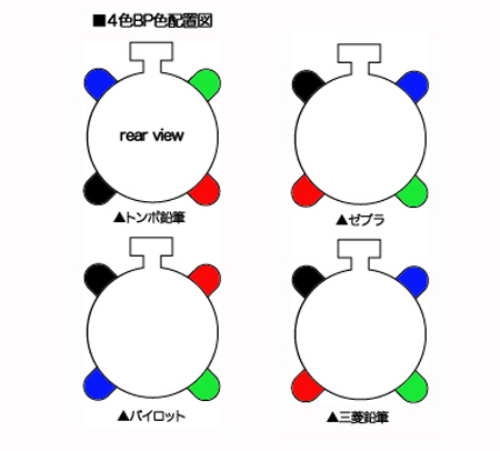 「パイロット方式」は2色、3色ボールペンを使ってきたひとが4色に移行してくることを前提にした配置です。