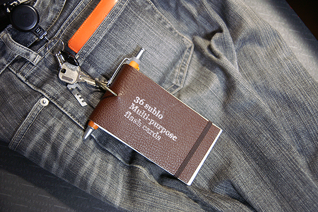 吊ってみる サブロで5×3カードホルダーを購ってきたので、腰から下げて使ってみました。でかいです。重いです。チャチなキーバックを購ったので、だらーんと下がってしまいます。ボールペンはアウトドア使用を考えて、トンボ鉛筆のエアプレスにしたのですが。やっぱり押されてペン先が出てしまいます。当たり前ですよね。うーむ。改良の余地ありだな。 [0回] コメント コメントを書く コメントを書く コメント送信
