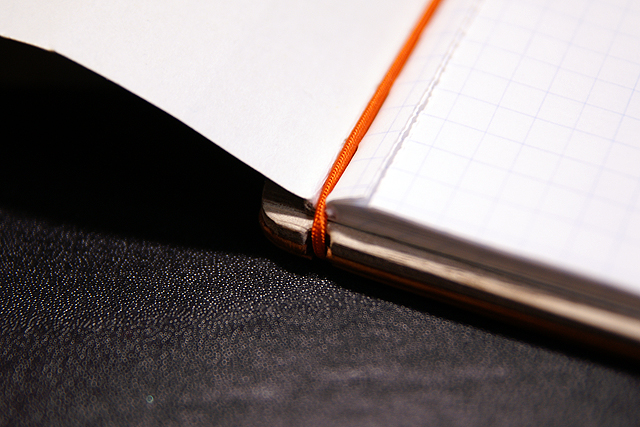 シンキングパワーノートの一ページ目、縫い目に食い込ませるようにゴムをかけると、ノートが固定されて動かなくなります。