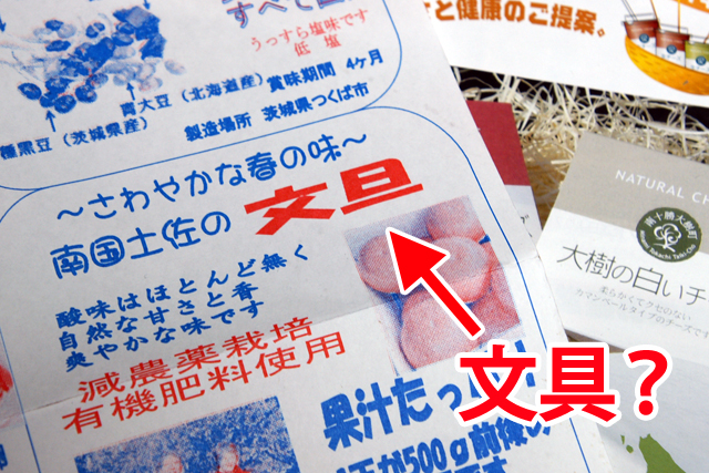 病的な見間違い えーと。うちで取っている宅配ヨーグルトといっしょに配られたチラシなんですが。ここ。「文旦」なんですけど、「文具」に見えるんですよ。かなり病気が進行していますね小生(笑) [0回] コメント コメントを書く コメントを書く コメント送信