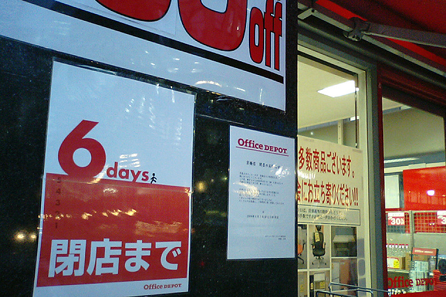 さらばオフィスデポ さいきん行ってなかったのでふらりと会社帰りに寄ってみたら、京橋のオフィスデポはカウントダウンが始まっていました。もう店内はがらがら。国産の文房具はほとんどなく、オフィスデポオリジナルブランドか、あるいはアメリカの輸入文具か、そこらへんだけが強引に堆く積まれている状態に。閑散とした店内があまりに寂寞としているので、結局何も買わずに出てきてしまいました。食い尽くされて、誰も食べないまずい肉と骨の部分だけが残った──そんなイメージです。寂しいものですね。閉店セールって。 [0回] コメント コメントを書く コメントを書く コメント送信