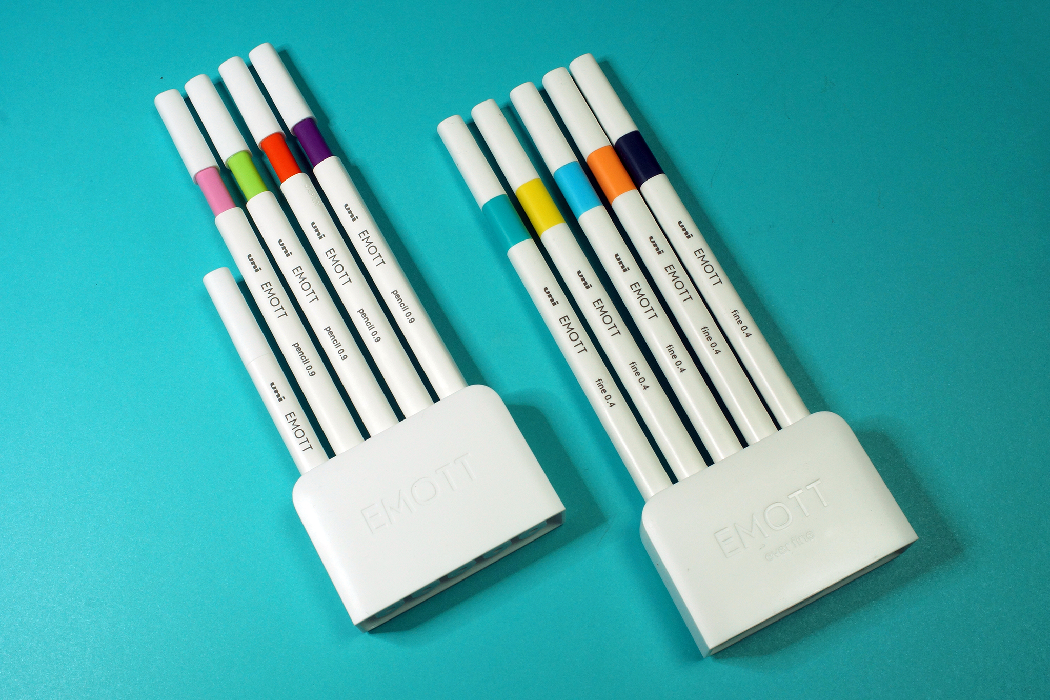 エモットは0.4ミリ樹脂チップ搭載カラーペンのシリーズから始まりましたが、カラーセットはエモットもエモットペンシルも同様のケーススタンドにペンが刺さった状態で販売されています。